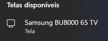 5. Aguarde o nome da TV (Samsung BU8000 65 TV) aparecer na tela do notebook e selecione-o utilizando o mouse. Caso o nome da TV não apareça, verifique se ela está no modo “Compartilhamento de Tela” (“Screen Share”).