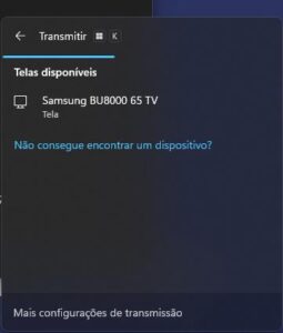 4. Este comando abrirá uma janela na tela do notebook que apresentará a lista dos dispositivos/telas disponíveis para transmissão de imagens.