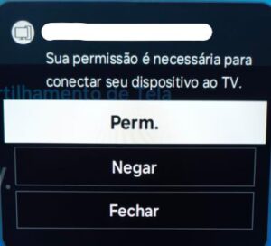 6. Na tela da TV será apresentada uma mensagem solicitando que se aceite (ou não) o pedido de conexão. Selecione [Aceitar/OK] utilizando o controle remoto da TV.